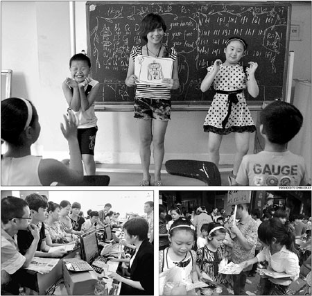 Top: Children at an English class at a training institute in Wenling, Zhejiang province. Left: Parents help their children apply for English classes at a private educational establishment in Guiyang, capital of Guizhou province. Right: Training institute staff members deliver ads for post-school courses to students in Fuyang, Anhui province. Provided to China Daily, Wu Dongjun / for China Daily, Hei Bai / for China Daily |