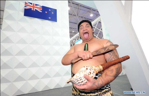 An exhibitor from New Zealand makes face during the 3rd China (Guizhou) International Alcoholic Beverage Expo in Guiyang, capital of southwest China's Guizhou Province, Sept. 9, 2013. The four-day expo kicked off on Monday. (Xinhua/Yang Ying)